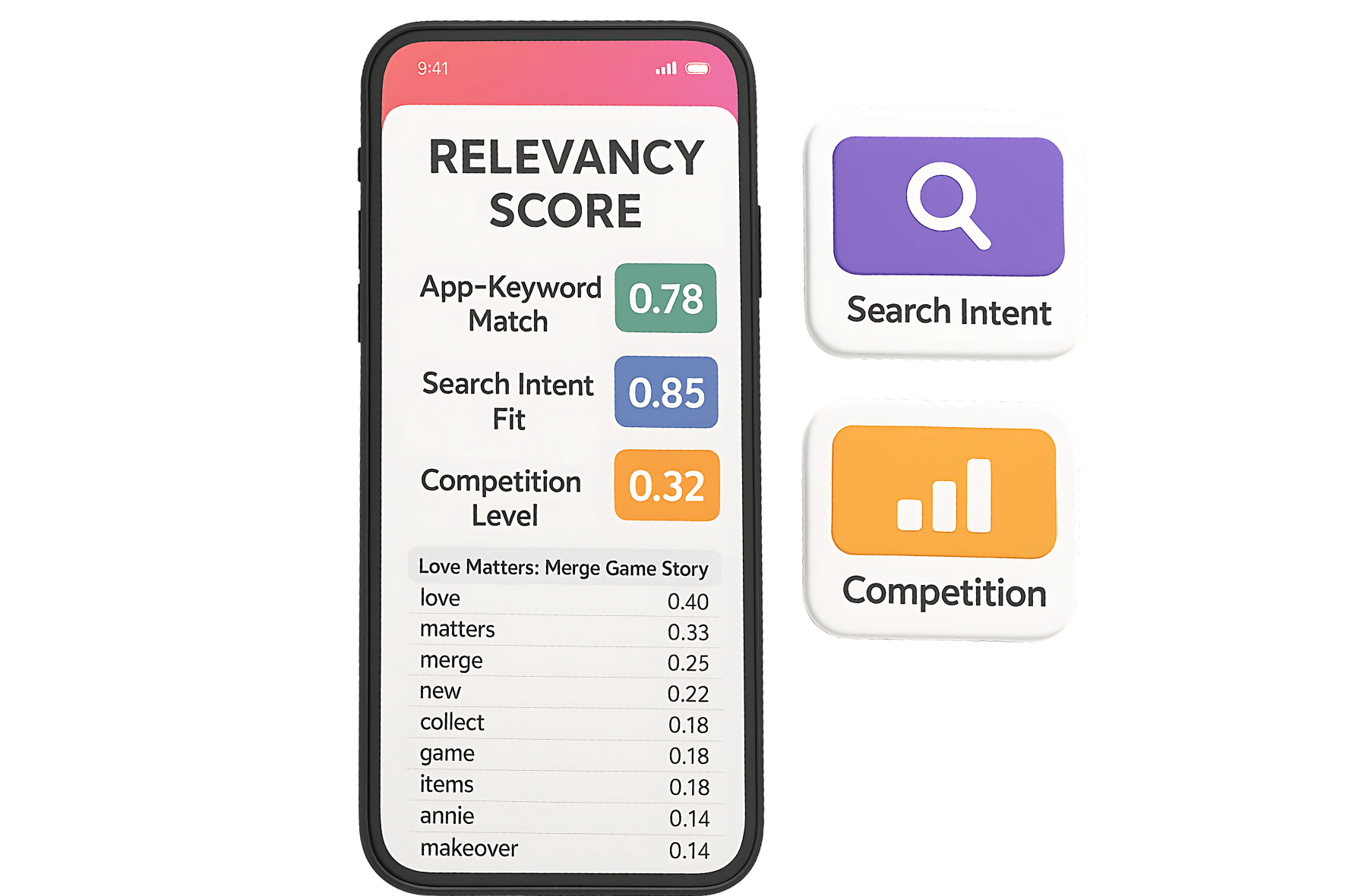 Analyze how closely keywords align with your app’s content and audience to ensure maximum ranking relevance.
