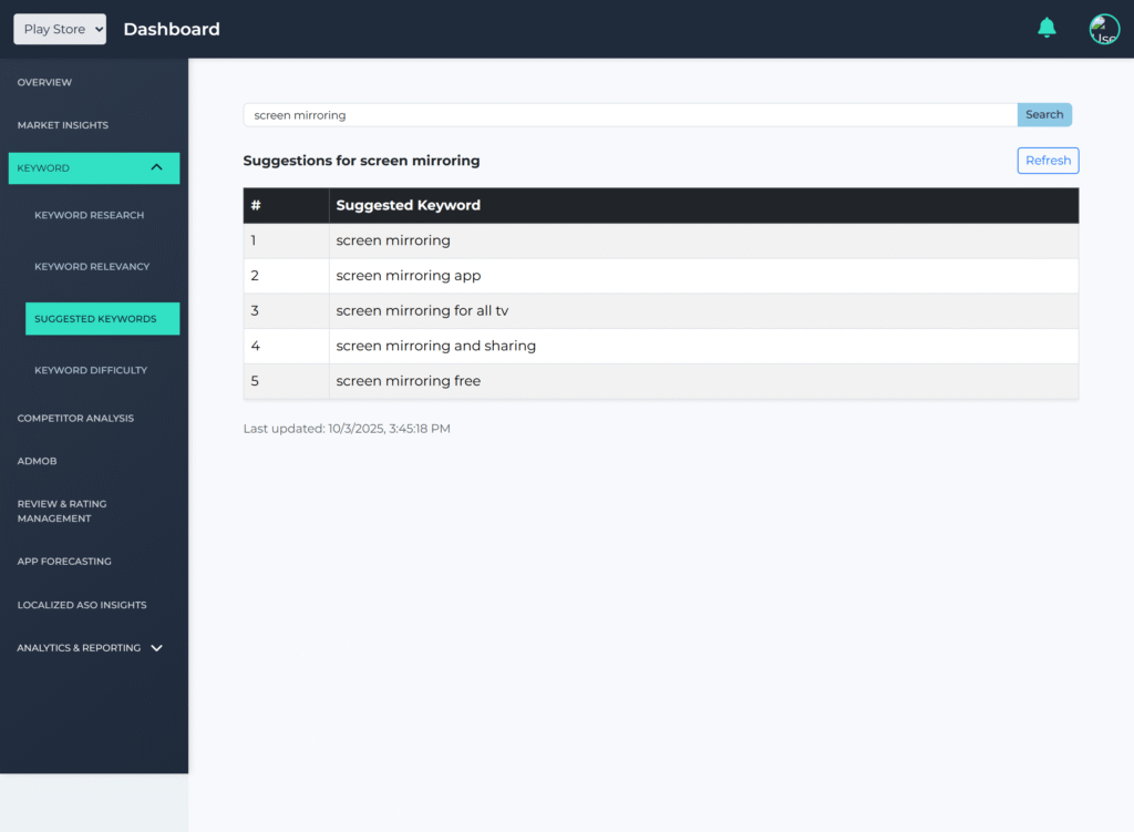 The Suggested Keywords module takes the guesswork out of keyword research by providing you with a refined list of high-impact keywords tailored to your app’s niche. These suggestions are based on real user search behavior, helping you identify exactly what your audience is looking for. By aligning your app listing with these popular and trending search terms, you increase visibility, attract more organic installs, and stay ahead of competitors who may be missing these opportunities. Instead of spending hours trying to predict user behavior, you get actionable, data-driven keyword recommendations that guide your strategy and fuel your app’s growth.
